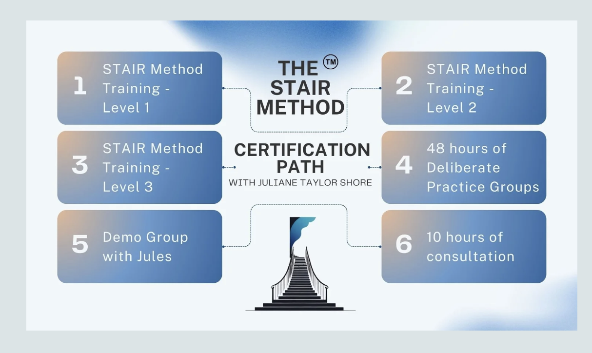 I will be offering STAIR Phase 1 Deliberate Practice (DP) Groups for those who have completed steps 1, 2, and 3 of the STAIR Certification Path and are ready to begin Phase 1 (step 4 on the graphic).